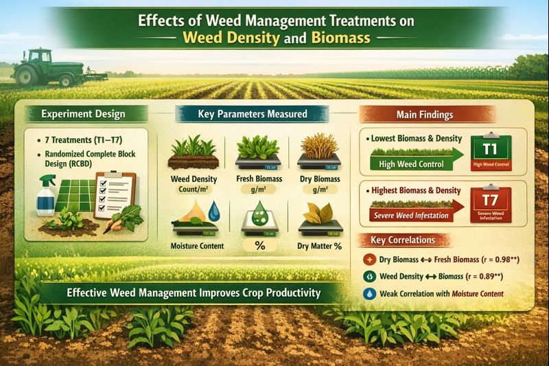 Weeds are one of the major limitations to the productivity of crops in that they compete with vital resources like light, nutrients, water, and space. The current research aimed to determine the efficacy of various weed management treatments on the weed density, biomass production, weed moisture content and species composition. The experiment was planned in a randomized complete block design (RCBD) involving seven treatments (T1–T7) and three replications. The data were systematically measured on weed flora, weed density (2.54–33.79 plants m⁻²), fresh biomass (14.04–241.29 g m⁻²), dry biomass (7.00–149.21 g m⁻²), moisture content (41.99–241.29%), and dry-matter percentage (35.49–57.00%). The ANOVA showed that the effect of treatments on all the parameters measured was highly significant (p < 0.01), especially on fresh and dry biomass, indicating that the treatments strongly suppressed weeds. T1 had the lowest weed density (2.54 plants m⁻²), fresh biomass (14.04 g m⁻²), and dry biomass (7.00 g m⁻²), while T7 had the highest values (33.79 plants m⁻², 241.29 g m⁻², and 149.21 g m⁻², respectively), indicating weed suppression of more than 90% under T1 compared to T7. Correlation analysis showed strong positive relationships among weed density, fresh biomass, and dry biomass (r = 0.86–0.98, p < 0.01). This confirms that higher weed populations lead to increased biomass. The content of moisture had weak and non-significant correlations (r = –0.13 to –0.03) with other characteristics, indicating its weak influence on weed growth dynamics. Weed density data showed that T1 recorded the lowest populations of broad-leaves (5.00 plants m⁻²), sedges (0.67 plants m⁻²), khabal (2.00 plants m⁻²), and madhana (0.00 plants m⁻²) at 15 DAS, whereas T7 exhibited the highest densities for broad-leaves (92.00 plants m⁻²) and sedges (28.67 plants m⁻²), indicating severe infestation under untreated conditions. At 30 DAS, T4 recorded the lowest densities of broad-leaves and sedges (3.33 plants m⁻² each), and T3 had the lowest khabal density (0.67 plants m⁻²), while T7 again recorded the maximum values for most weed groups, confirming its lowest weed suppression efficiency. In general, the findings indicated the significance of proper weed-management methods to minimize weed pressure and improve crop production systems. The results are useful in the choice of suitable weed control measures in similar agro-ecological settings. The graphical abstract has been drawn in Figure 1.